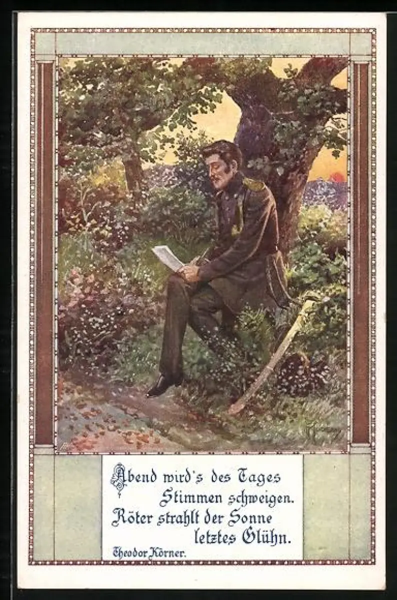 Künstler-AK Franz Kuderna: Theodor Körner schreibt ein Gedicht im Walde