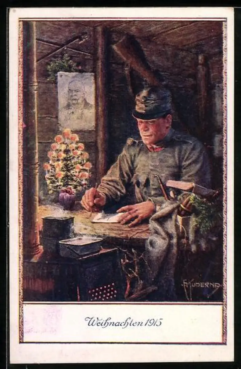 Künstler-AK Franz Kuderna: Weihnachten 1915, Soldat in Bunker