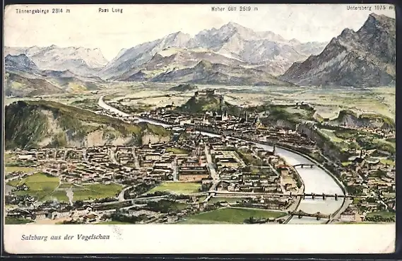 Künstler-AK Franz Kulstrunk: Salzburg, Teilansicht aus der Vogelschau, Hoher Göll, Untersberg & Pass Lueg
