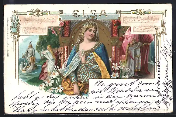 Künstler-AK Franz Stassen: Elsa, Lohengrin auf seinem Schwanenboot, Notenzeilen