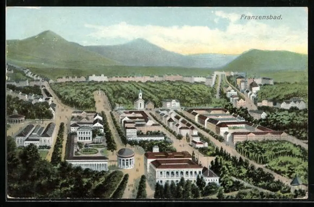 Künstler-AK Franzensbad, Teilansicht mit Kirche und Strassenpartie