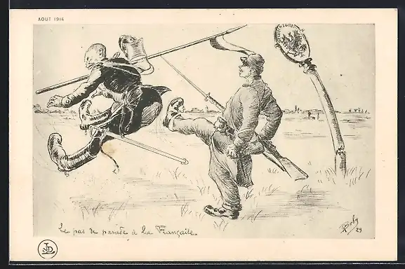 Künstler-AK Französischer Soldat tritt deutschem Soldat an der Grenze in den Hintern