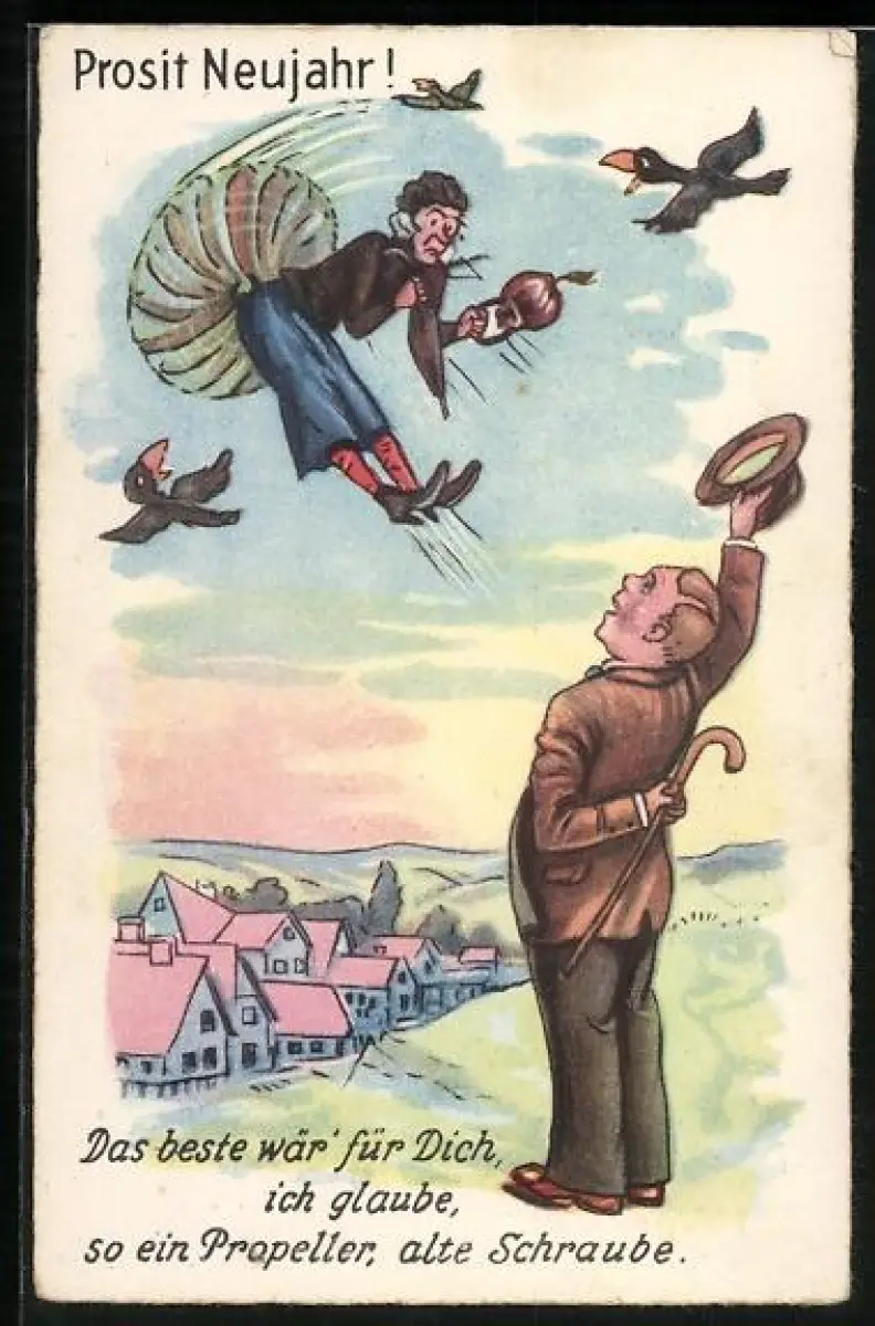 Künstler-AK Frau fliegt mit einem Propeller davon, Prosit Neujahr