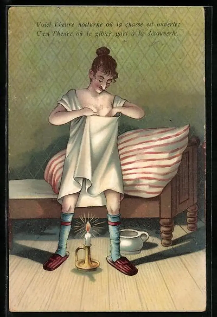 Künstler-AK Frau im Nachthemd steht über eine Kerze und schaut sich ins Kleid
