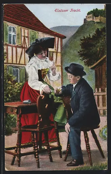 Künstler-AK Frau in Elsässer Tracht ermahnt den Herren nicht so viel zu trinken