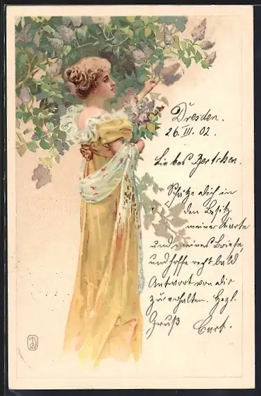 Künstler-AK Frau in gelbem Kleid mit Fliederbusch, Jugendstil