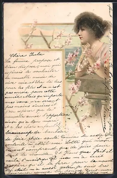 Künstler-AK Frau mit blühendem Baum im Jugendstil