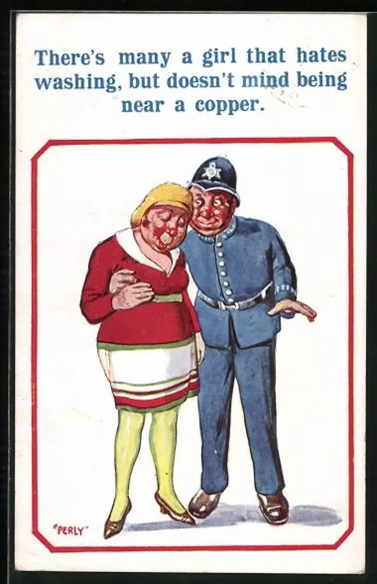 Künstler-AK Frau mit einem Polizistin, There`s many a girl that hates washing, but doesn`t mind being near a copper