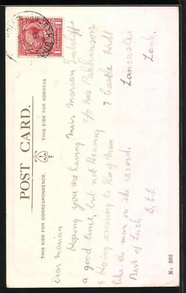 Personenbezogene Daten auf der Rückseite der Karte wurden durch blauen Textmarker unkenntlich gemacht. Die blauen Stellen sind auf die Vorderseite durchgeweicht und wirken sich negativ auf das Postkartenfoto aus