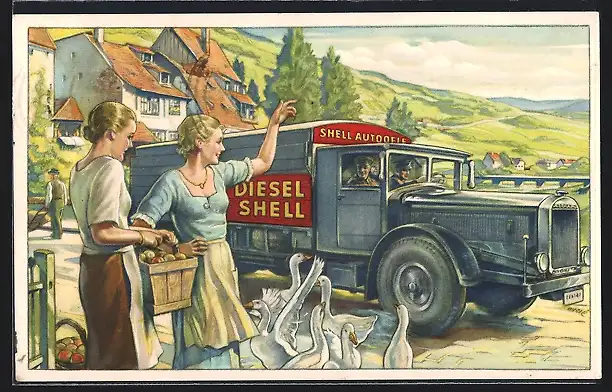 Künstler-AK Frauen winken Lastkraftwagen mit Shell-Diesel zu