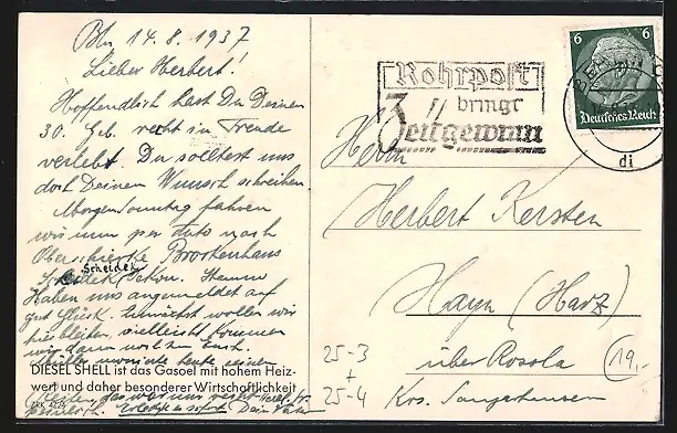 gelaufen 1937, Eckknick li. unten, guter Zustand