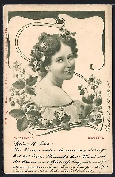 Künstler-AK Frauenportrait mit Erdbeerzweigen, Ornament