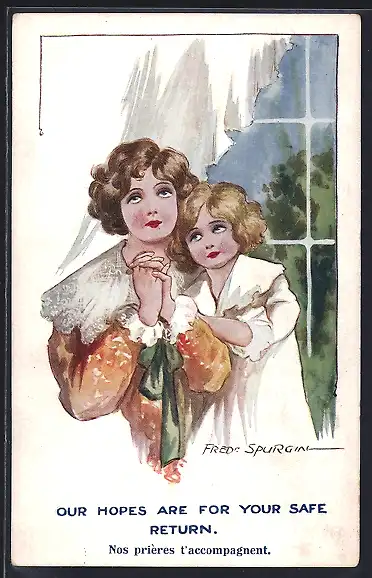Künstler-AK Fred Spurgin: F. Spurgin: Mutter betet für ihren Mann im Felde, Tochter an ihrer Seite