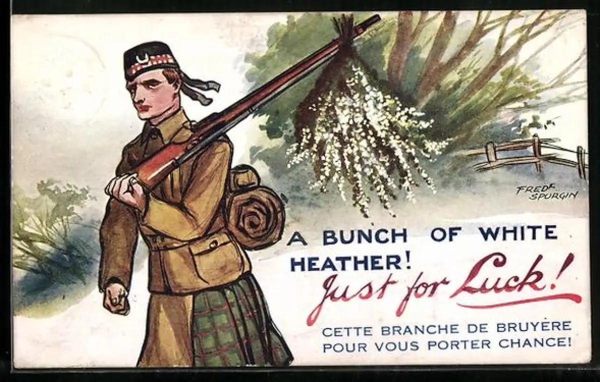 Künstler-AK Fred Spurgin: Schotte trägt einen Strauss Heide am Gewehr