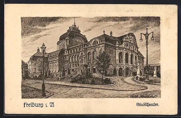 Künstler-AK Freiburg i. B., Blick auf das Stadttheater