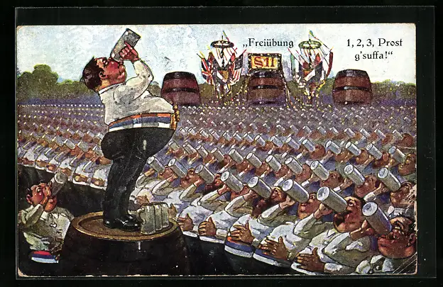 Künstler-AK Freiübung, 1, 2, 3 Gsuffa, Trinkerhumor