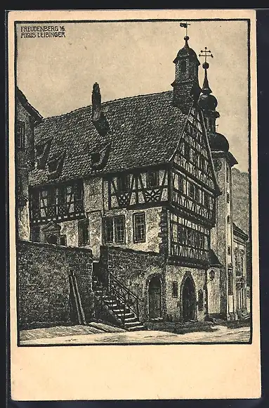 Künstler-AK Freudenberg / Main, Ortspartie mit Rathaus