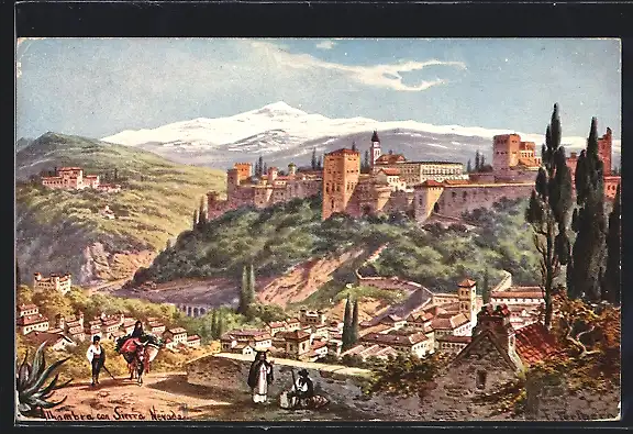 Künstler-AK Friedrich Perlberg: Alhambra con Sierra Nevada, Blick zur Stadt auf dem Berg