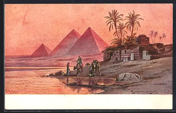 Künstler-AK Friedrich Perlberg: Gizeh, Kamelreiter mit Blick zu den Pyramiden