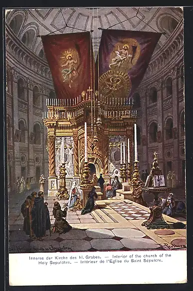 Künstler-AK Friedrich Perlberg: Palästina, Inneres der Kirche des heiligen Grabes, Church of the Holy Sepulchre