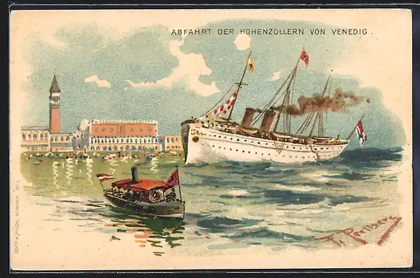 Künstler-AK Friedrich Perlberg: Venedig, Abfahrt der Hohenzollern, der Staatsyacht des Deutschen Reiches