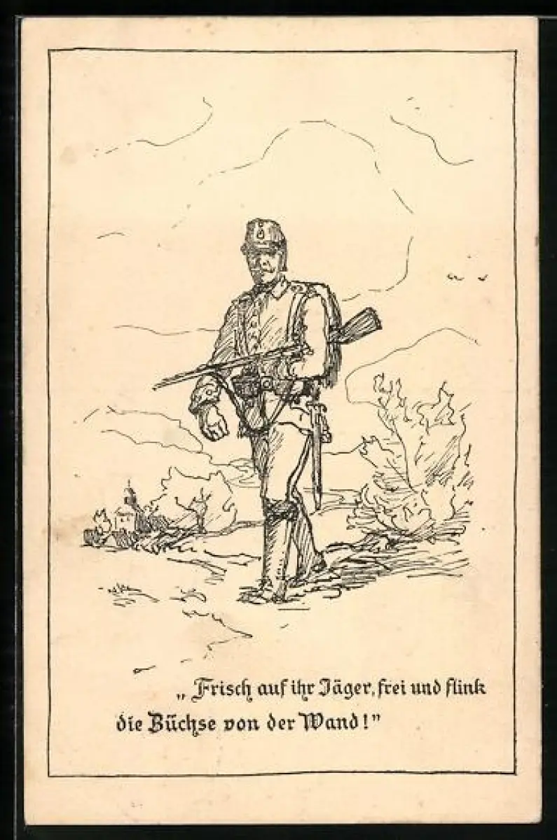Künstler-AK Frisch auf ihr Jäger..., Infanterist in Uniform