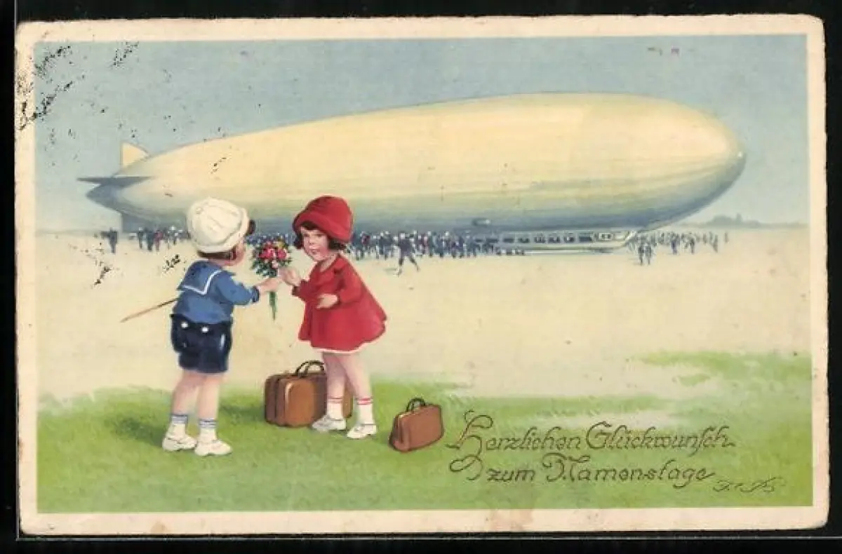 Künstler-AK Fritz Baumgarten: Reisende vor einem Zeppelin wird mit Blumen verabschiedet