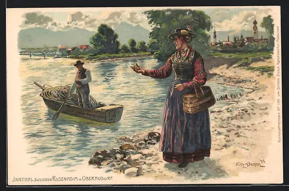 Künstler-AK Fritz Bergen: Rosenheim, Frau winkt Mann im Boot auf Inn