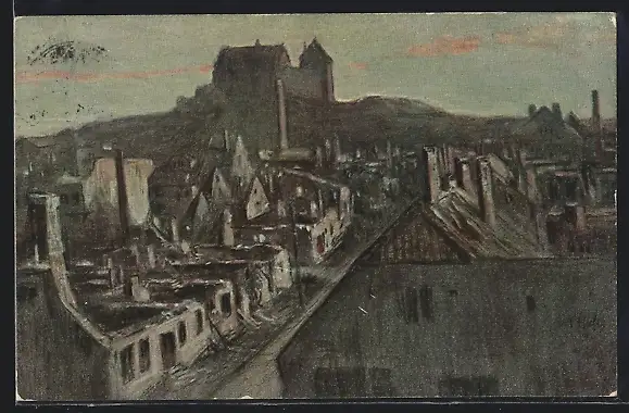 Künstler-AK Fritz Hass: Neidenburg, Blick über die Ruinen der Stadt