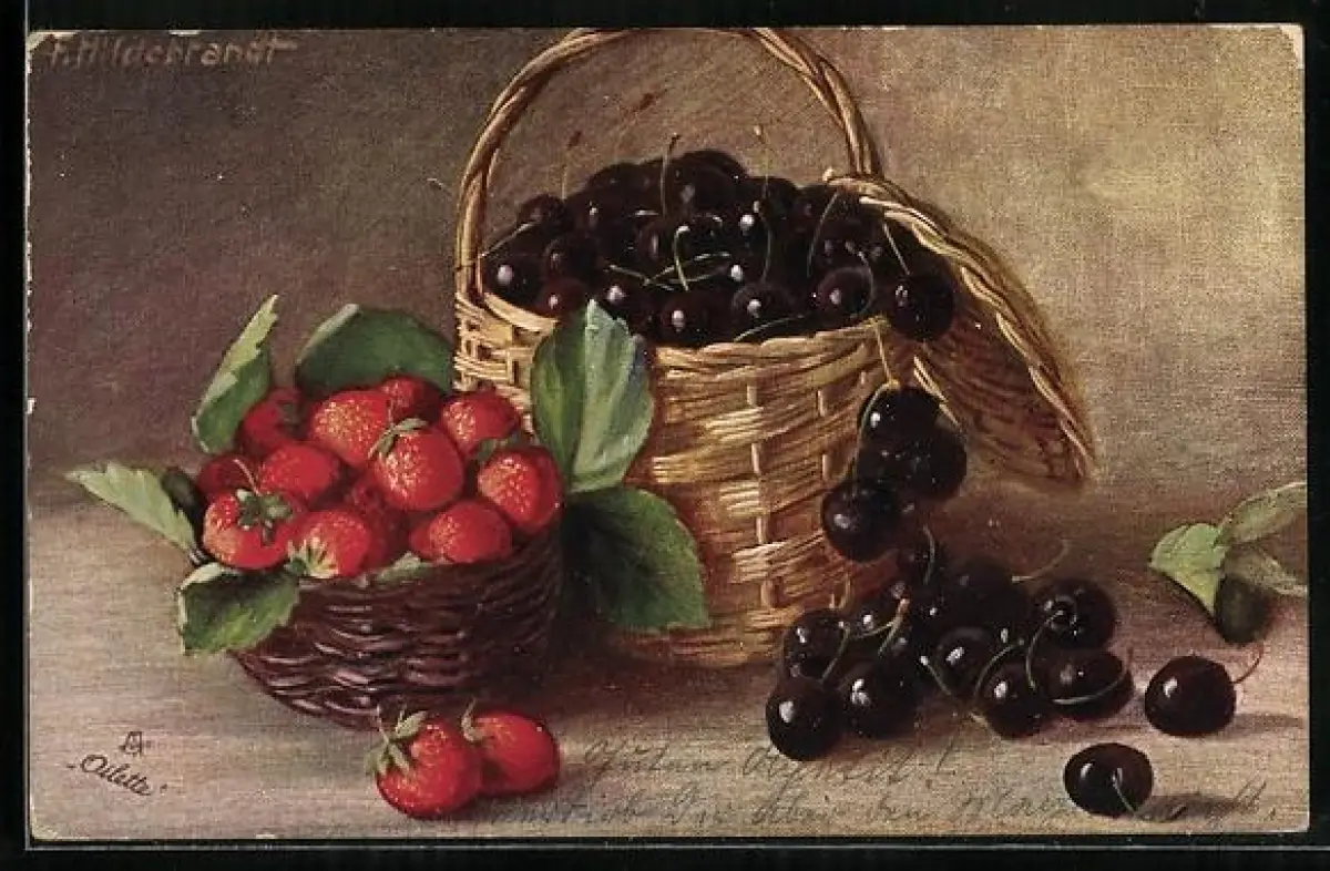 Künstler-AK Fritz Hildebrandt: Stilleben mit Erdbeeren und Kirschen