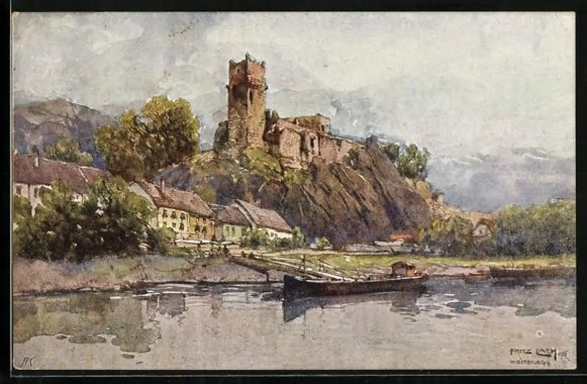 Künstler-AK Fritz Lach: Weitenegg an der Donau, Uferpartie mit Burgruine