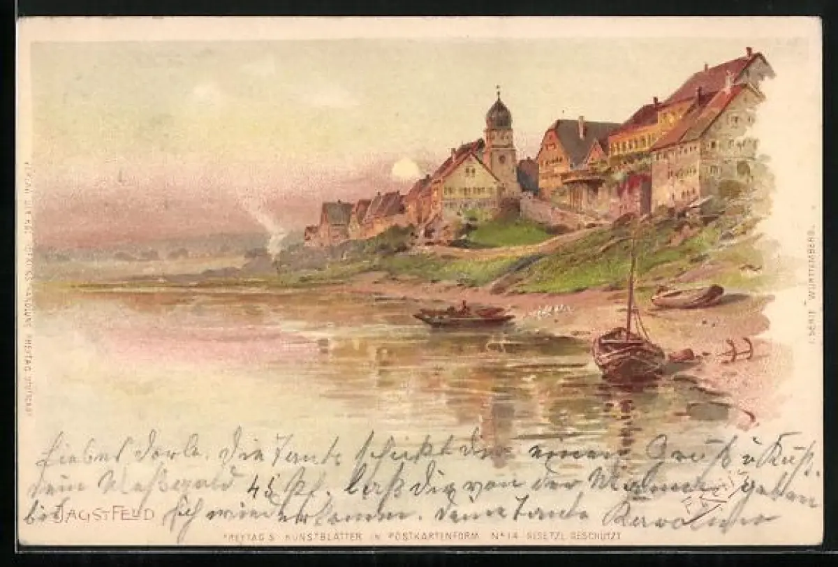 Künstler-AK Fritz Reiss: Jagstfeld, Partie am Fluss bei untergehender Sonne