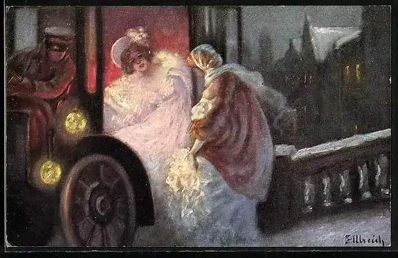 Künstler-AK Fritzi Ulreich: Frauen in festlichen Kleidern steigen ins Auto