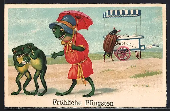 Künstler-AK Frosch-Mutter und ihre Kinder kaufen bei einem Maikäfer Süssigkeiten, Fröhliche Pfingsten