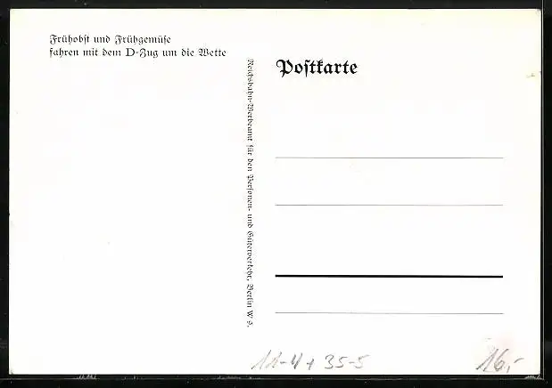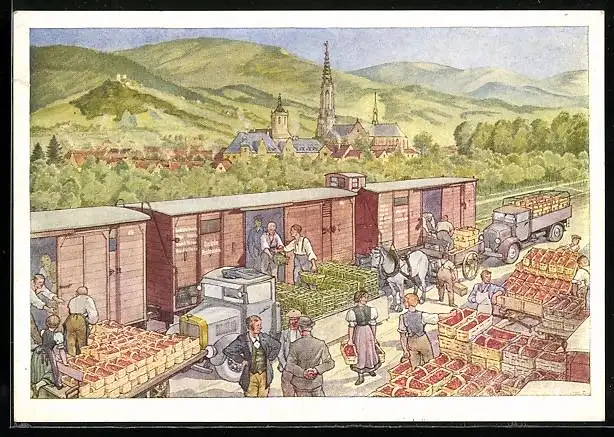 Künstler-AK Frühobst und Frühgemüse fahren mit dem D-Zug um die Wette
