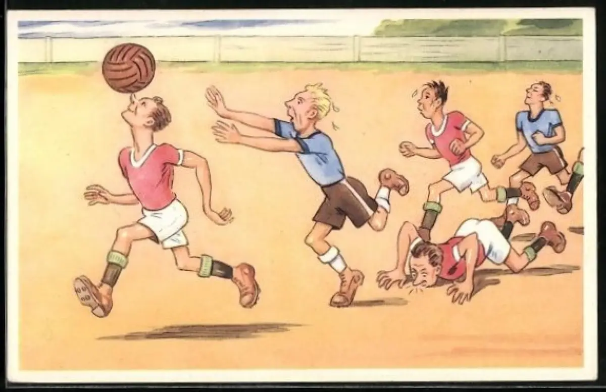 Künstler-AK Fussball-Spieler balanciert den Ball auf seiner Nase