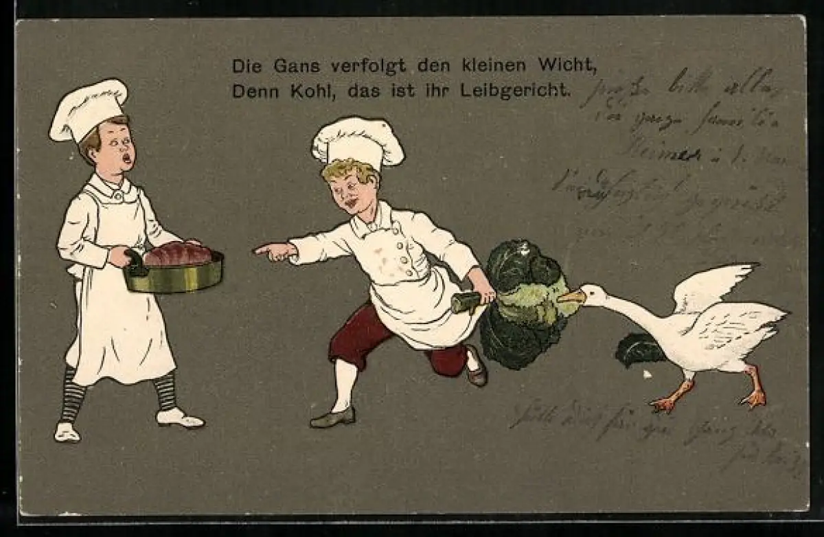 Künstler-AK Gans verfolgt einen kleinen koch mit Kohl in der Hand