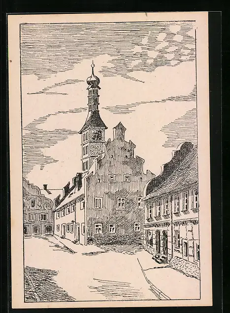 Künstler-AK Geiselhöring / Ndby., Strassenpartie mit Rathaus