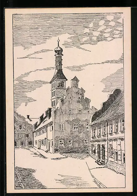 Künstler-AK Geiselhöring / Ndby., Strassenpartie mit Rathaus