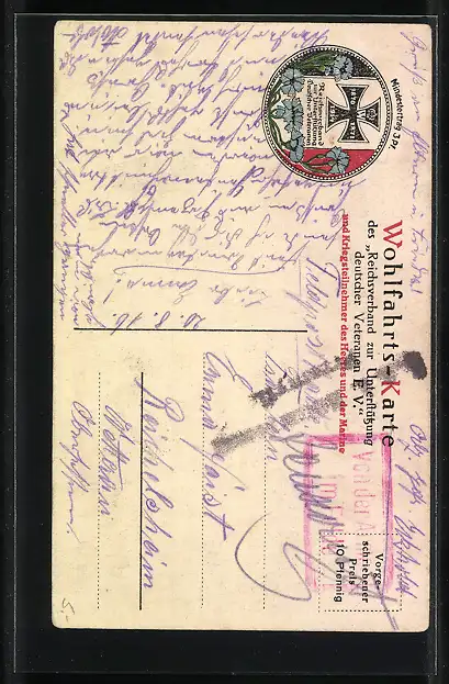 Personenbezogene Daten auf der Rückseite der Karte wurden durch blauen Textmarker unkenntlich gemacht. Die blauen Stellen sind auf die Vorderseite durchgeweicht und wirken sich negativ auf das Postkartenfoto aus