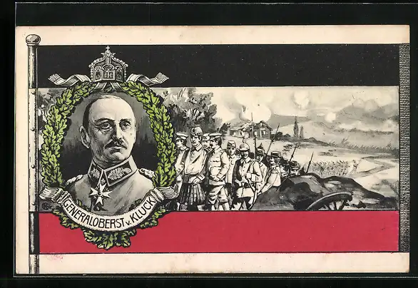 Künstler-AK Generaloberst Alexander von Kluck, die Armee beim Marsch, Ansicht in der Reichsflagge