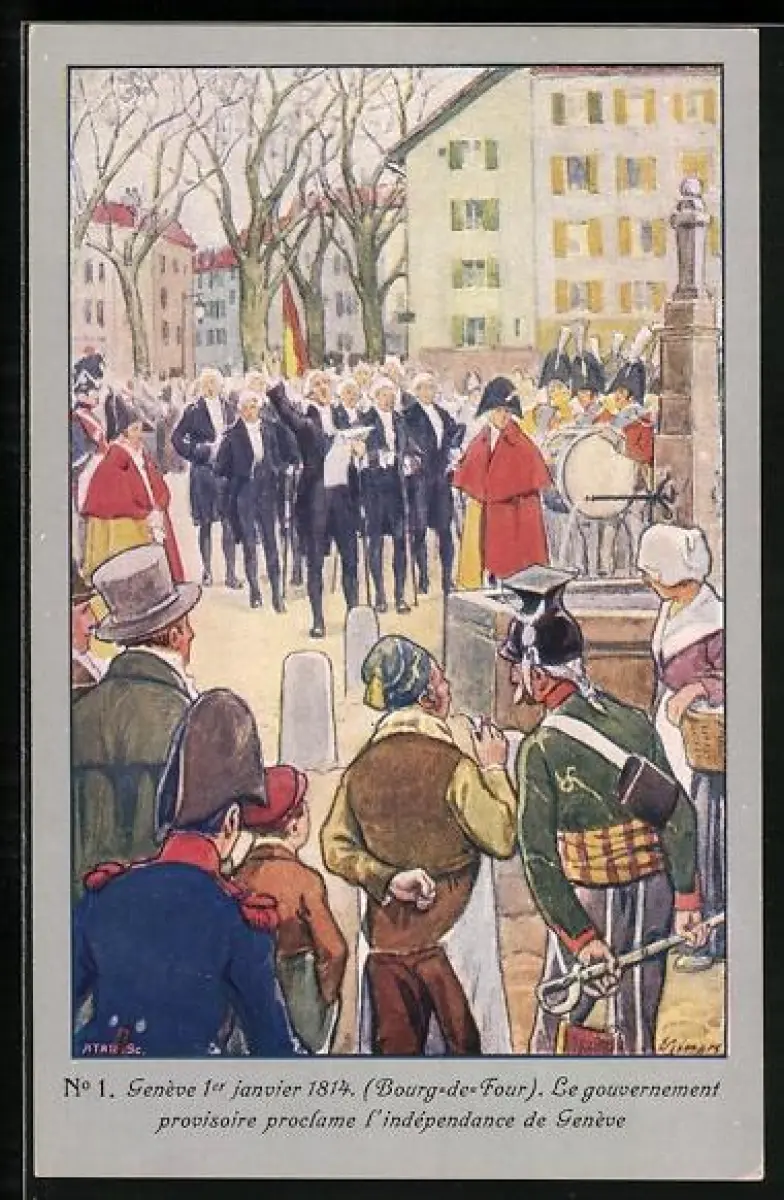 Künstler-AK Genève, Bour-de-Four, Le gouvernement provisoire provlame l`indépendance de Genève