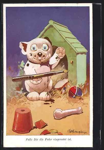 Künstler-AK Georg Edward Shepheard: Bonzo präsentiert einen Federhalter