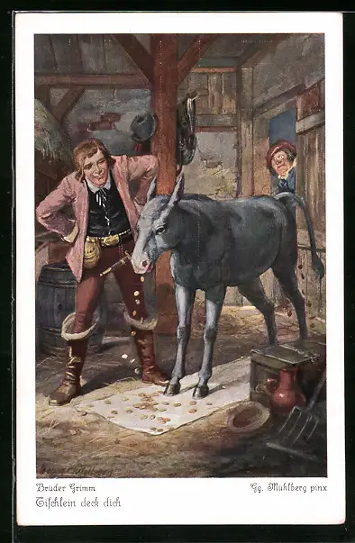 Künstler-AK Georg Mühlberg: Brüder Grimm Märchen, Tischlein deck dich, Goldesel