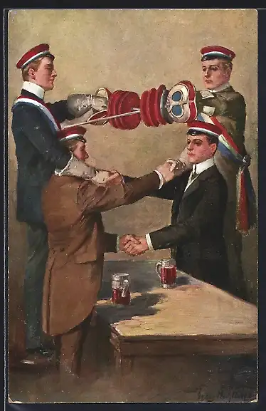 Künstler-AK Georg Mühlberg: Der Landesvater, Burschenschafter reichen sich die Hände, studentische Szene