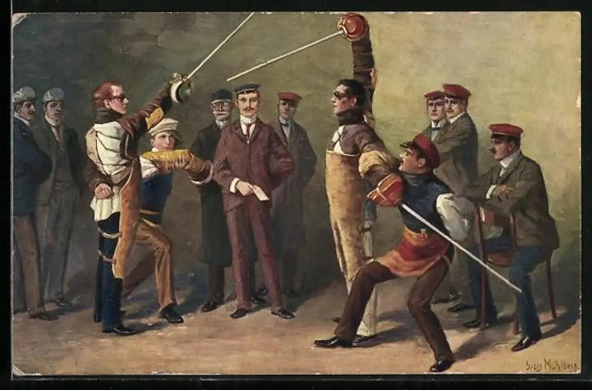Künstler-AK Georg Mühlberg: Studentenleben, Auf die Mensur, Fechten, Burschenschaftler
