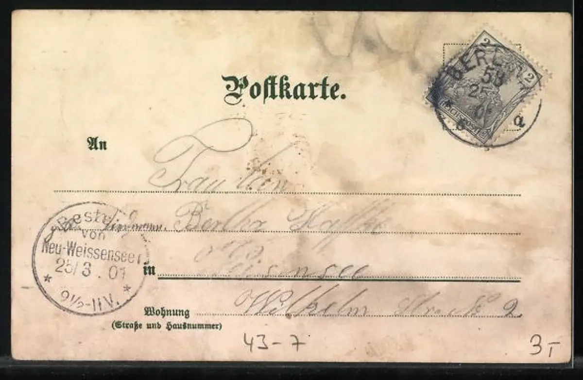 Personenbezogene Daten auf der Rückseite der Karte wurden durch blauen Textmarker unkenntlich gemacht. Die blauen Stellen sind auf die Vorderseite durchgeweicht und wirken sich negativ auf das Postkartenfoto aus