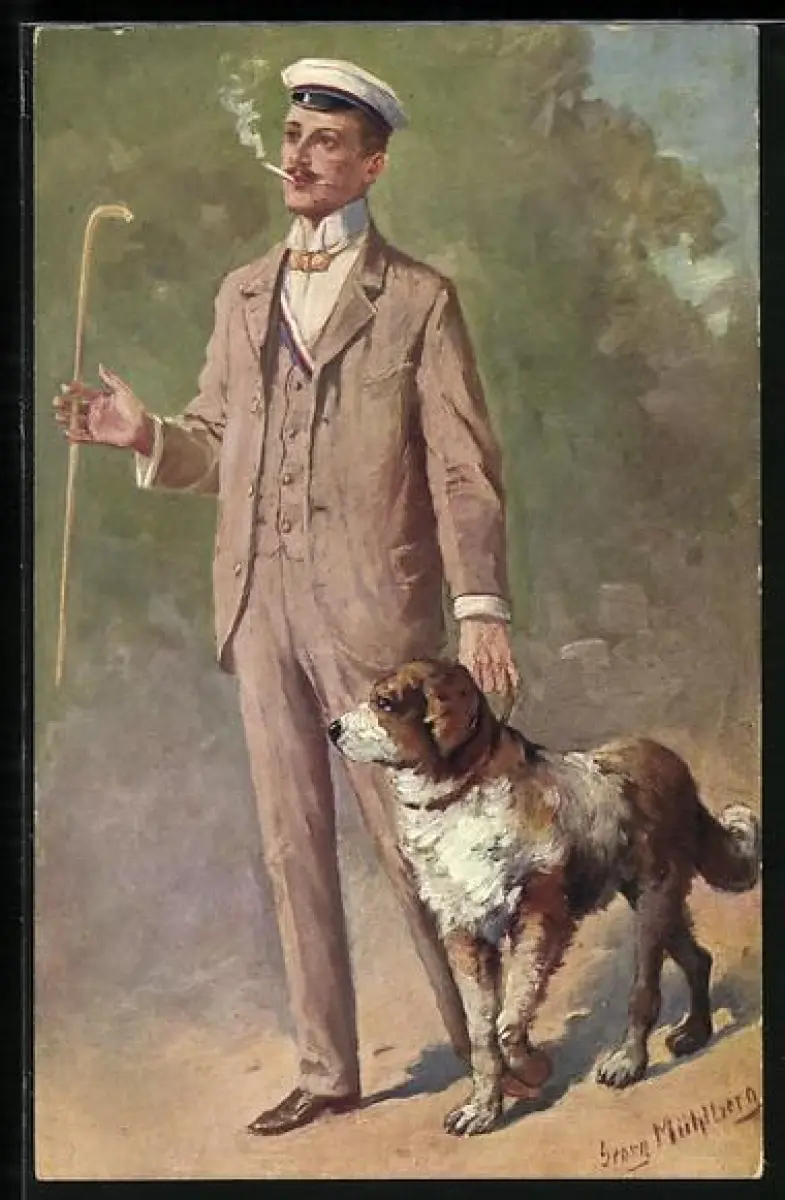 Künstler-AK Georg Mühlberg: studentische Szene, rauchender Mann mit Hund