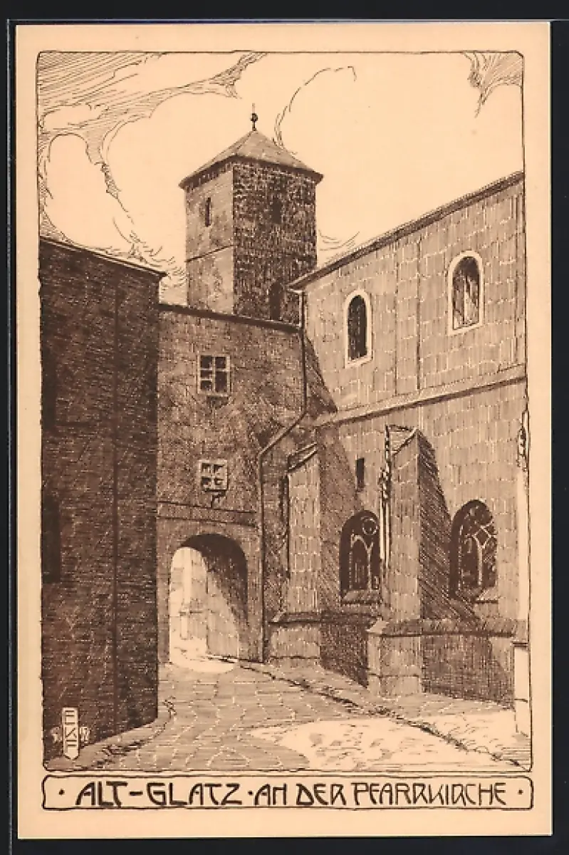 Künstler-AK Glatz, Partie an der Pfarrkirche