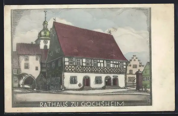 Künstler-AK Gochsheim, Rathaus mit Brunnen